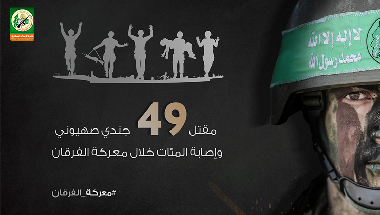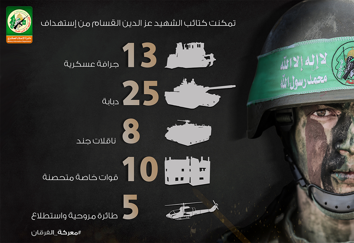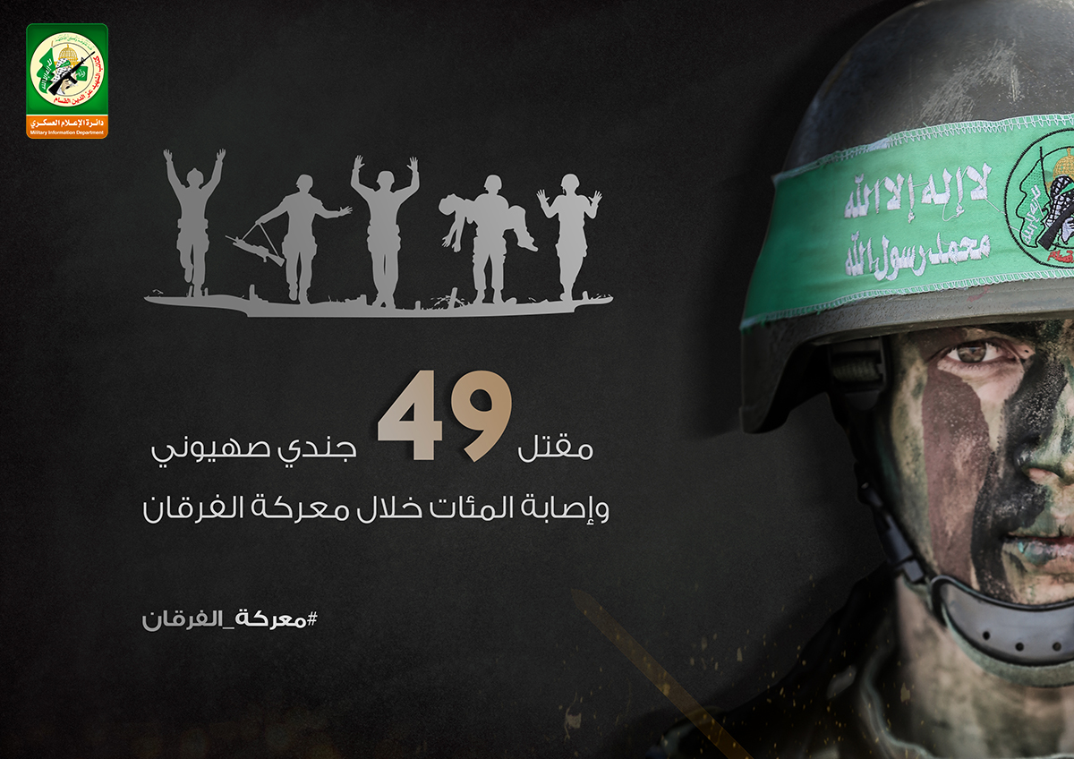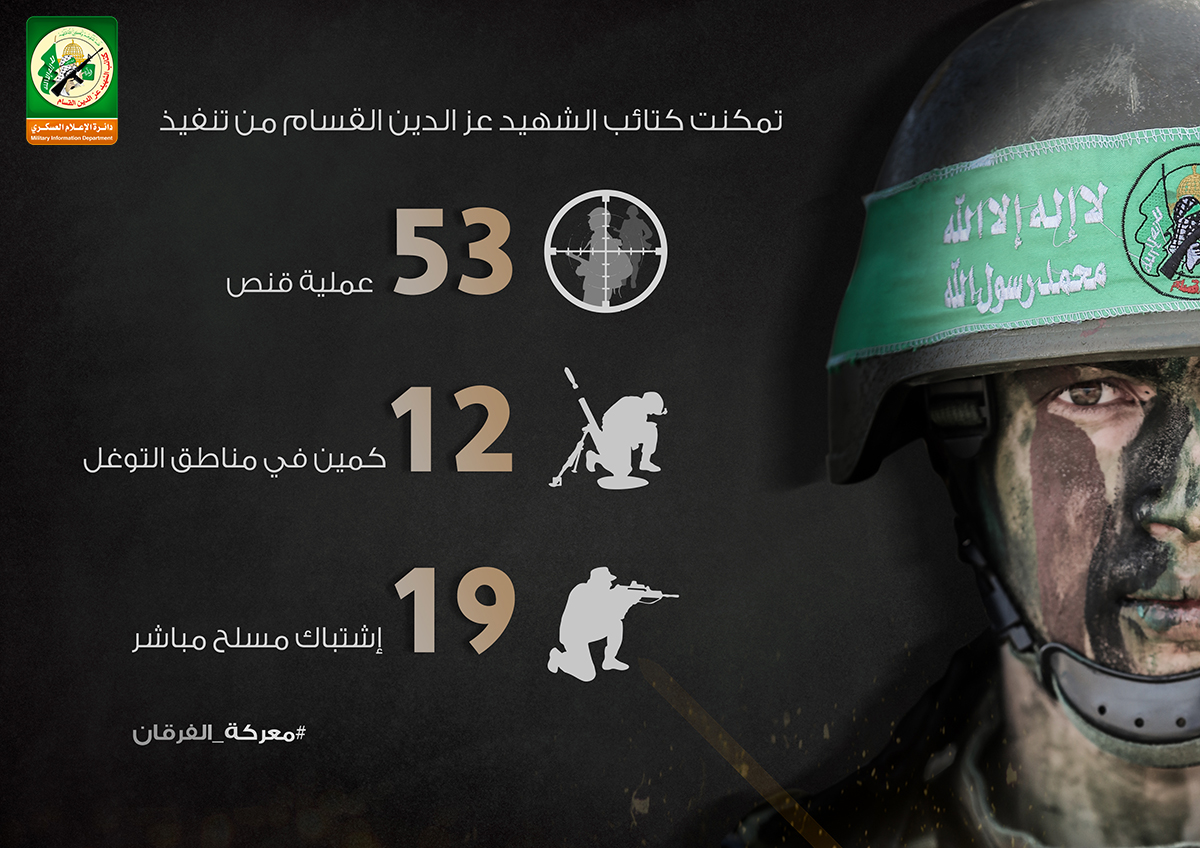 وأشارت كتائب القسام أنها قتلت خلال المواجهات المباشرة مع الجنود الصهاينة 49 جنديًا، وجرحت ما يزيد عن 411 آخرين، ونفذت أكثر من 53 عملية قنص للجنود الصهاينة، إضافة لإعطاب العديد من الآليات العسكرية.